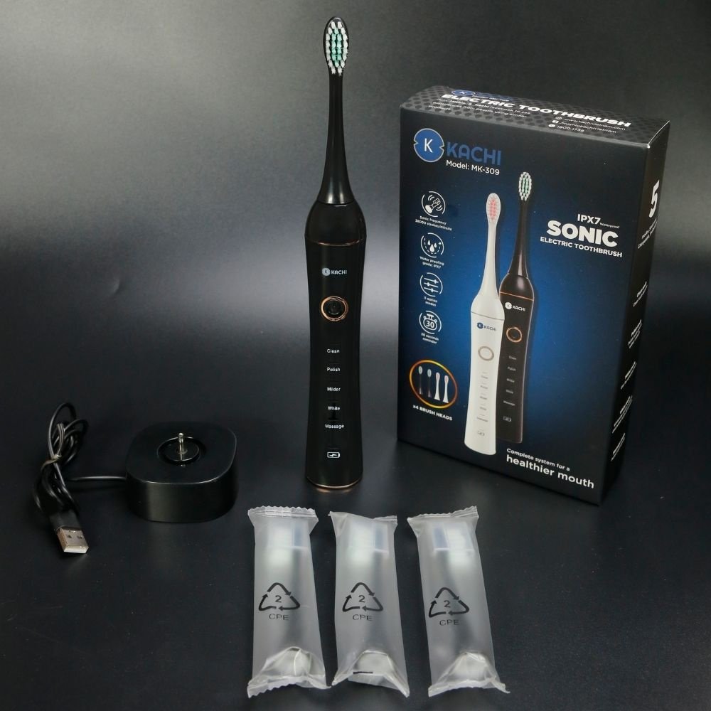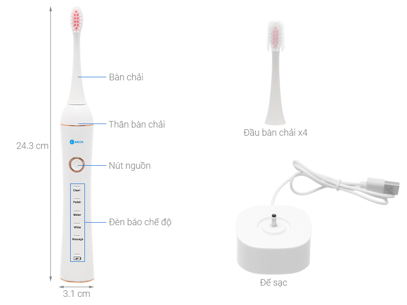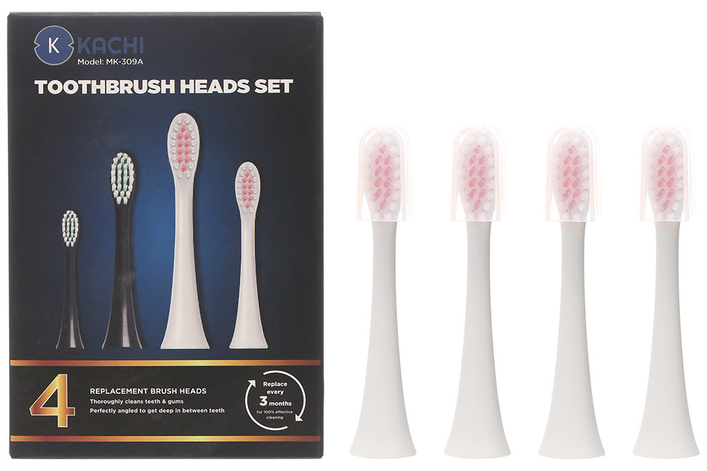 Đáp: Bộ bàn chải đánh răng Kachi đi kèm 4 đầu bàn chải và đế sạc