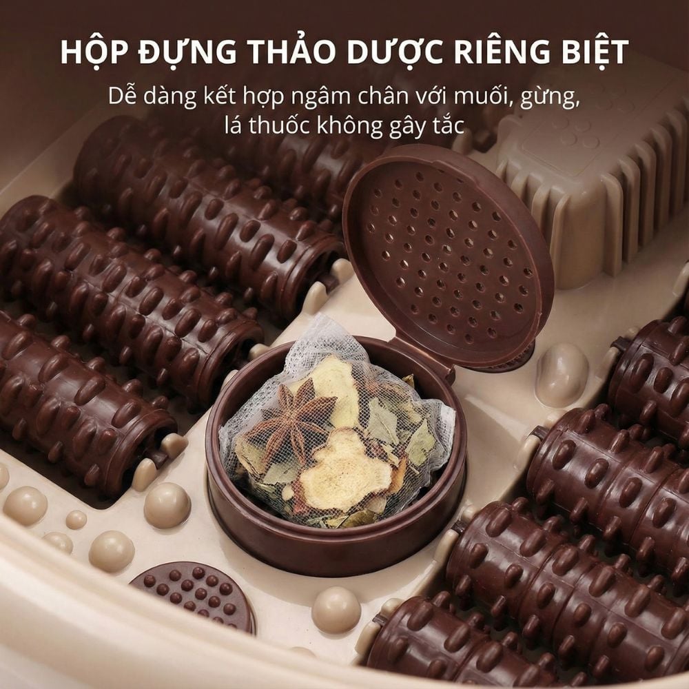 Khay Đựng Thảo Dược Tiện Lợi: Bồn có một đế dược liệu (khay đựng) riêng biệt. Bạn có thể dễ dàng thêm các loại thảo dược, muối ngâm chân, gừng, ngải cứu... để tăng cường hiệu quả trị liệu, khử mùi hôi chân và giải độc cơ thể.