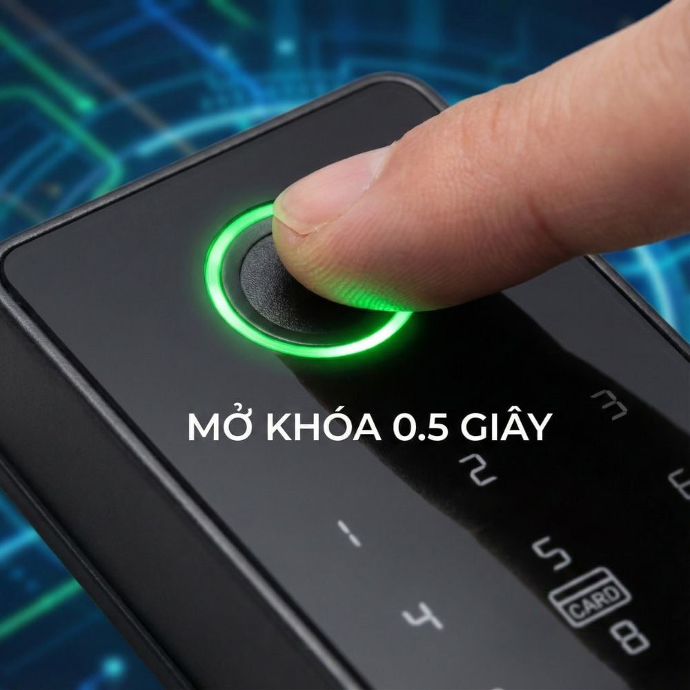 Vân tay đa điểm 360 độ: Công nghệ sinh trắc học bán dẫn nhận diện vân tay chỉ trong 0.5 giây. Nhận diện tốt ngay cả với vân tay mờ của người già hoặc trẻ em.