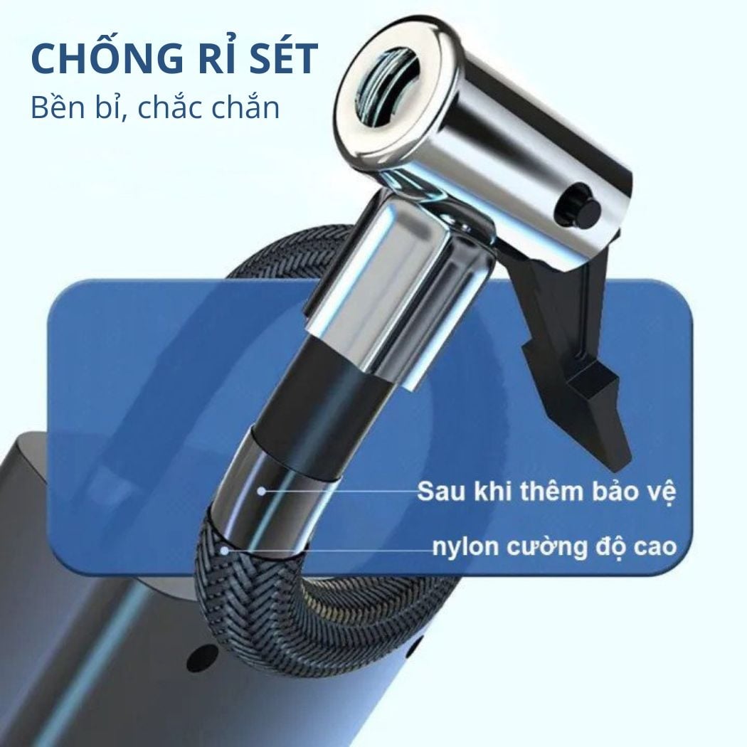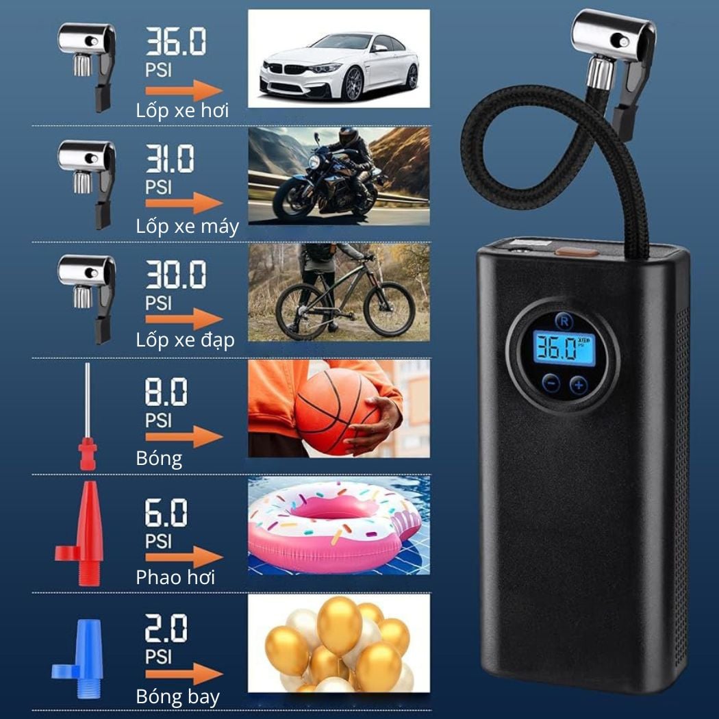 - Áp suất tối đa 150 PSI: Máy bơm có thể bơm hơi cho lốp xe lên đến 150 PSI, khiến nó trở nên lý tưởng cho cả xe đạp và ô tô.