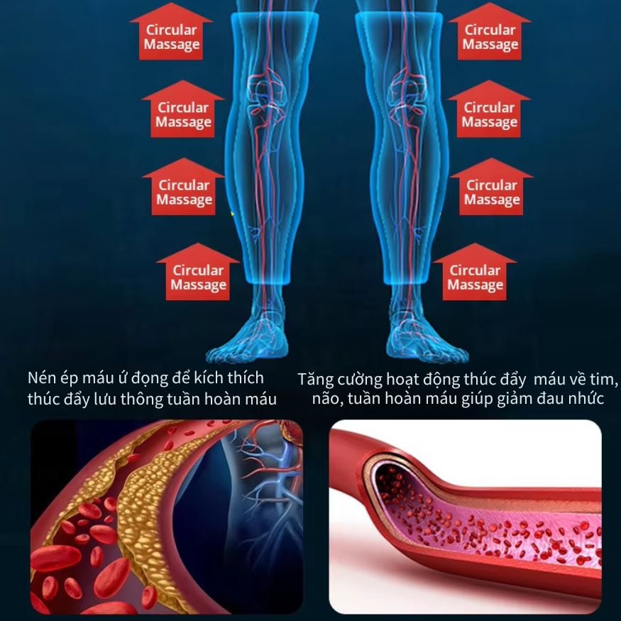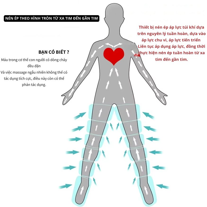 - Cải thiện lưu thông máu tự nhiên: Túi khí ép theo thứ tự từ chân đến đùi, đẩy máu về tim, giảm ứ đọng.
