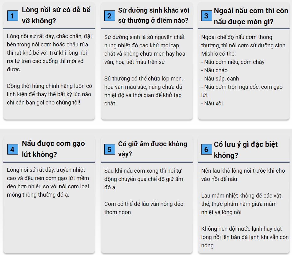 - So với các sản phẩm có lòng nồi chống dính hóa chất dễ bong tróc, nồi cơm điện lòng sứ Mishio không chỉ an toàn mà còn có độ bền cao hơn.