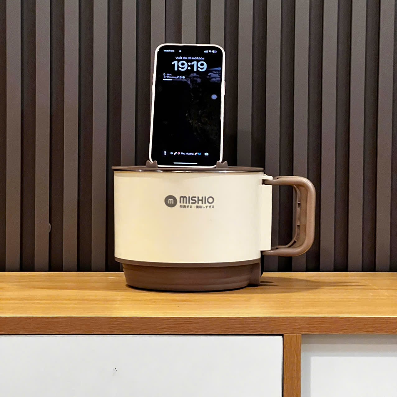 - Nắp có thể làm chân đế điện thoại giúp tiện lợi xem màn hình trong khi ăn